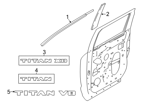 Nissan Titan XD parts. Parts like Exterior Trim - Front Door are shipped directly from authorized Nissan dealers and backed by the manufacturer's warranty. Parts fit for the following vehicle options. Engine: 8 Cyl 5.6 L GAS. Grade/Trim: PRO-4X, Platinum Reserve, S, SV.